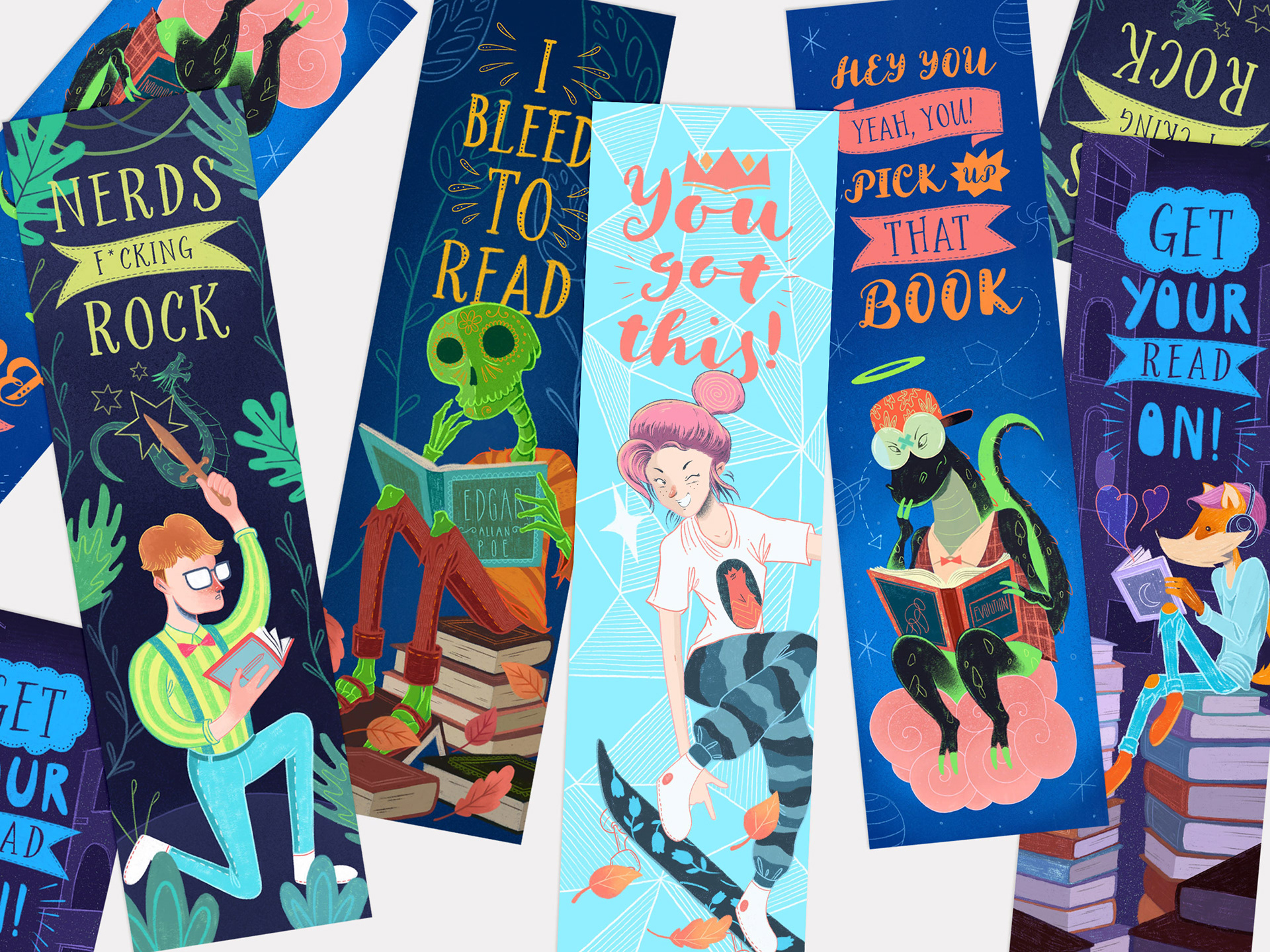 These bookmarks were created for Joshua Books Publishing and were a lot of fun to illustrate. They're for book-lovers of all ages, from children to teens to adults.
